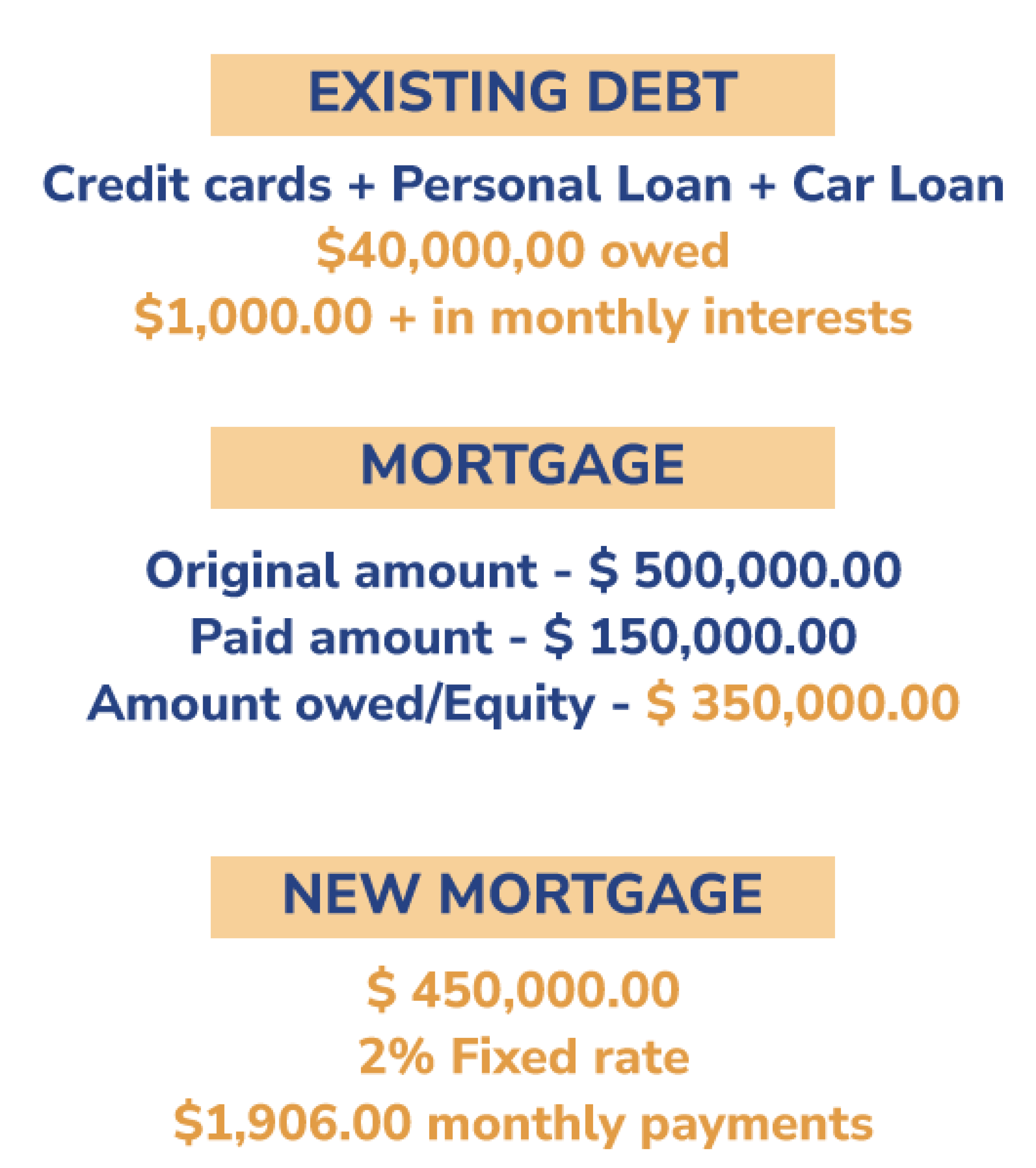 Si Debbie contracte une nouvelle hypothèque, même pour un montant de 450 000 $ (ce qui couvrira facilement les frais de clôture de son refinancement), cela fera plus que rembourser ses dettes, et à un taux fixe de 2,0 %, ses paiements mensuels seront de 1906 $.